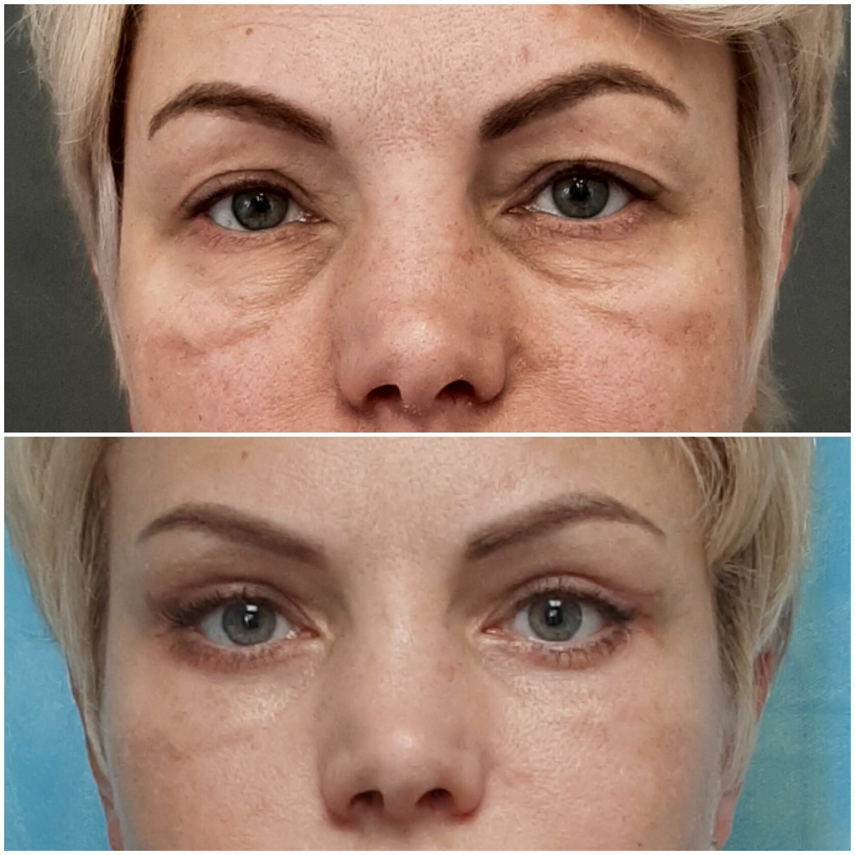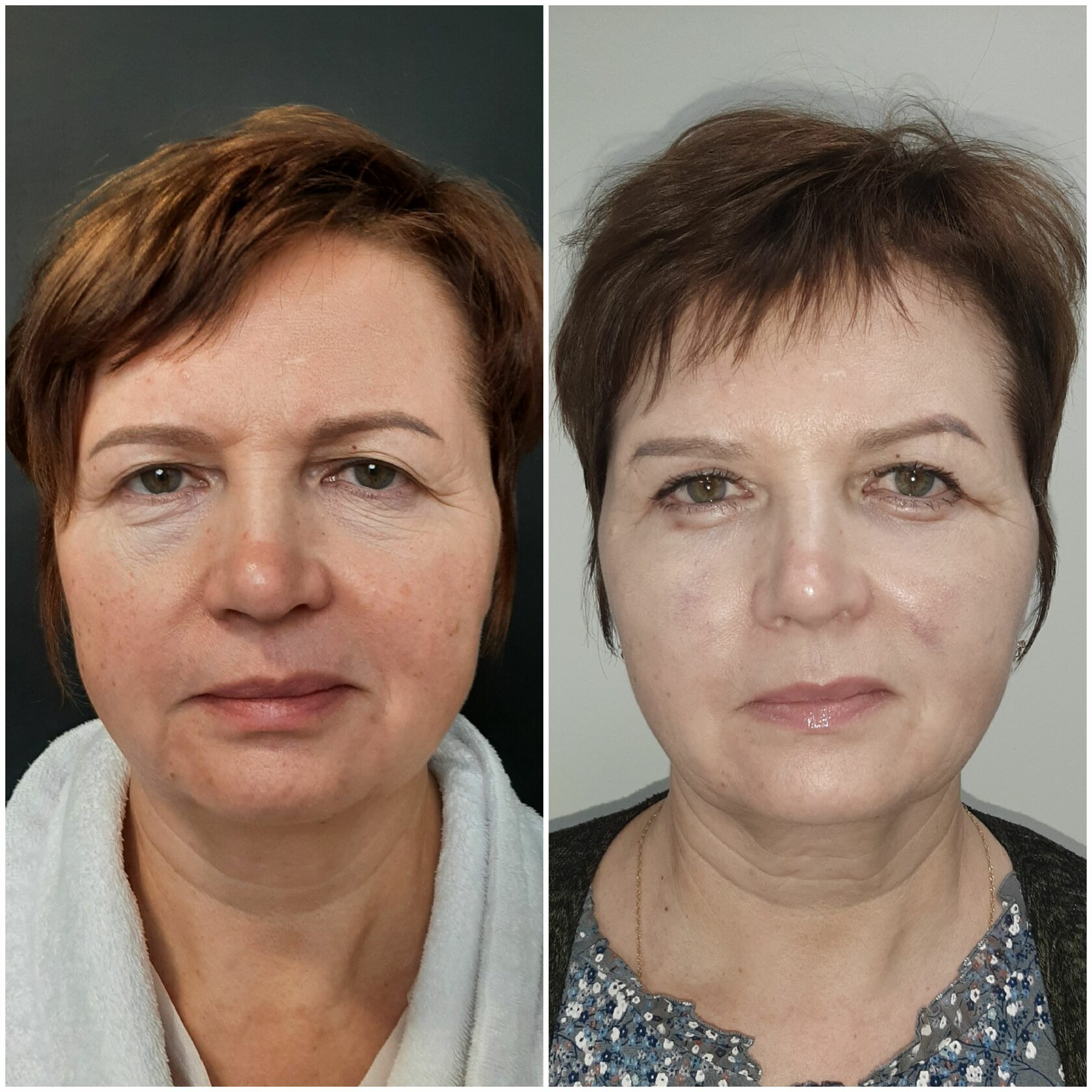 Обратилась к Остринской Татьяне Валентиновне с проблемой грыж и малярных мешков (суфов) под глазами и нарушенным носовым дыханием. После осмотра и консультации, было принято решение о проведении расширенной комплексной операции, в ходе которой разрешатся ещё несколько ярко выраженных проблем, связанных с возрастными изменениями (косметологи уже не справлялись). Было проведено: эндоскопическая подтяжка лба + височный лифтинг (+слёзная и носогубная борозды), верхняя и нижняя блефаропластика с перераспределением собственной жировой ткани (удаление маляров), подслизистая вазотомия носовых раковин.
